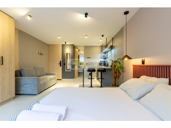 Apartaestudio en arriendo amoblado ubicado en sector exclusivo del Poblado, acabados de lujo, 1 espacio, 1 cocina abierta, libre de servicios, incluye internet, aire acondicionado, torre de lavado, cama queen, sofa cama, cerradura digital, opción de parqueadero. Cerca al parque del poblado, iglesia, restaurantes, transporte público, servicios complementarios.